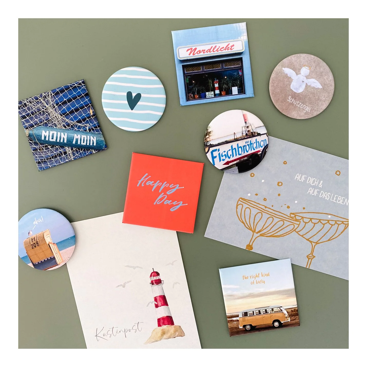 Die Magnete gibt es in rundem und eckigen Format. Sie sind sowohl mit Stadt- und Küstenmotiven erhältlich, als auch mit kleinen Botschaften und Grafiken. So ist für Jeden das Richtige dabei!
